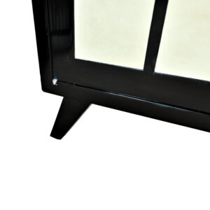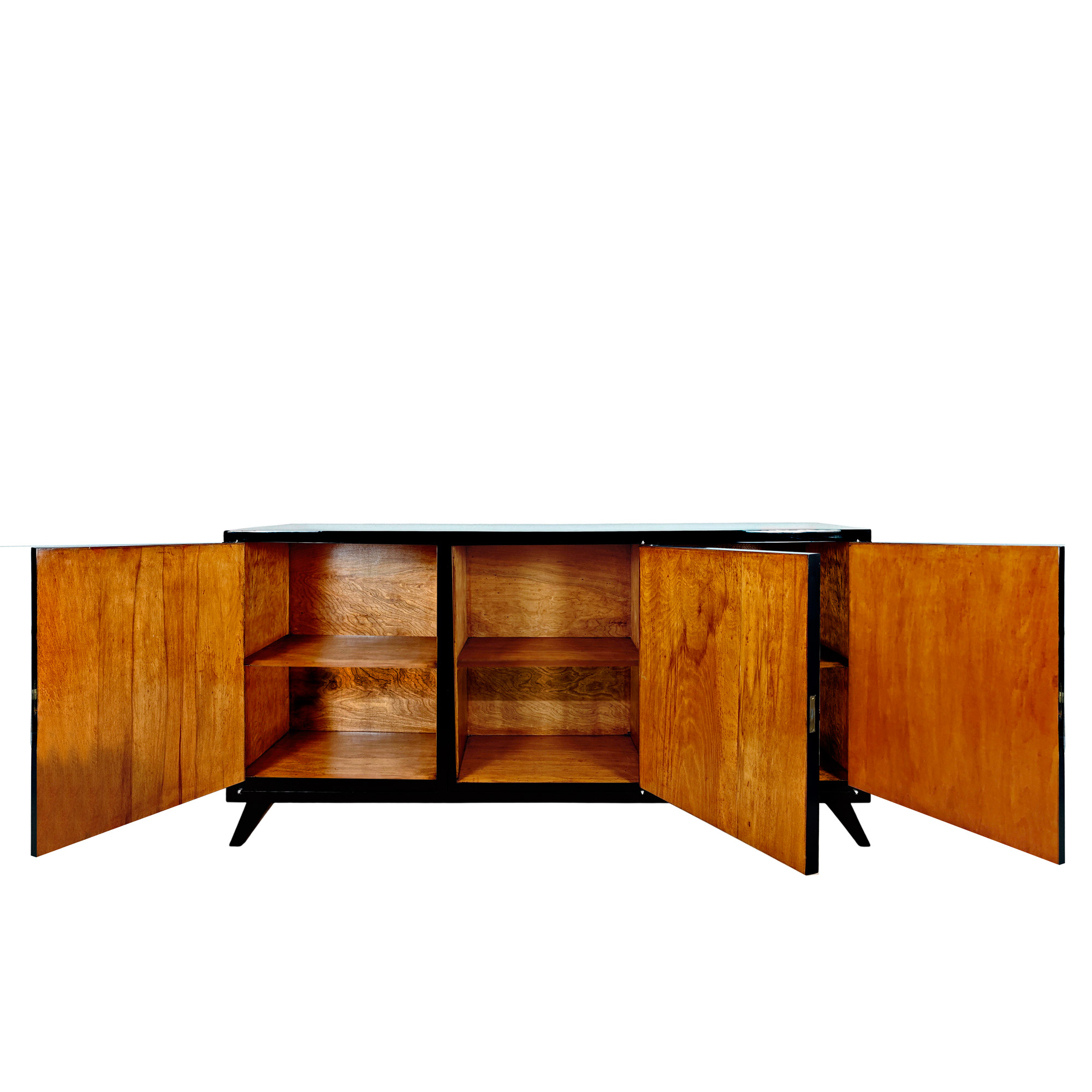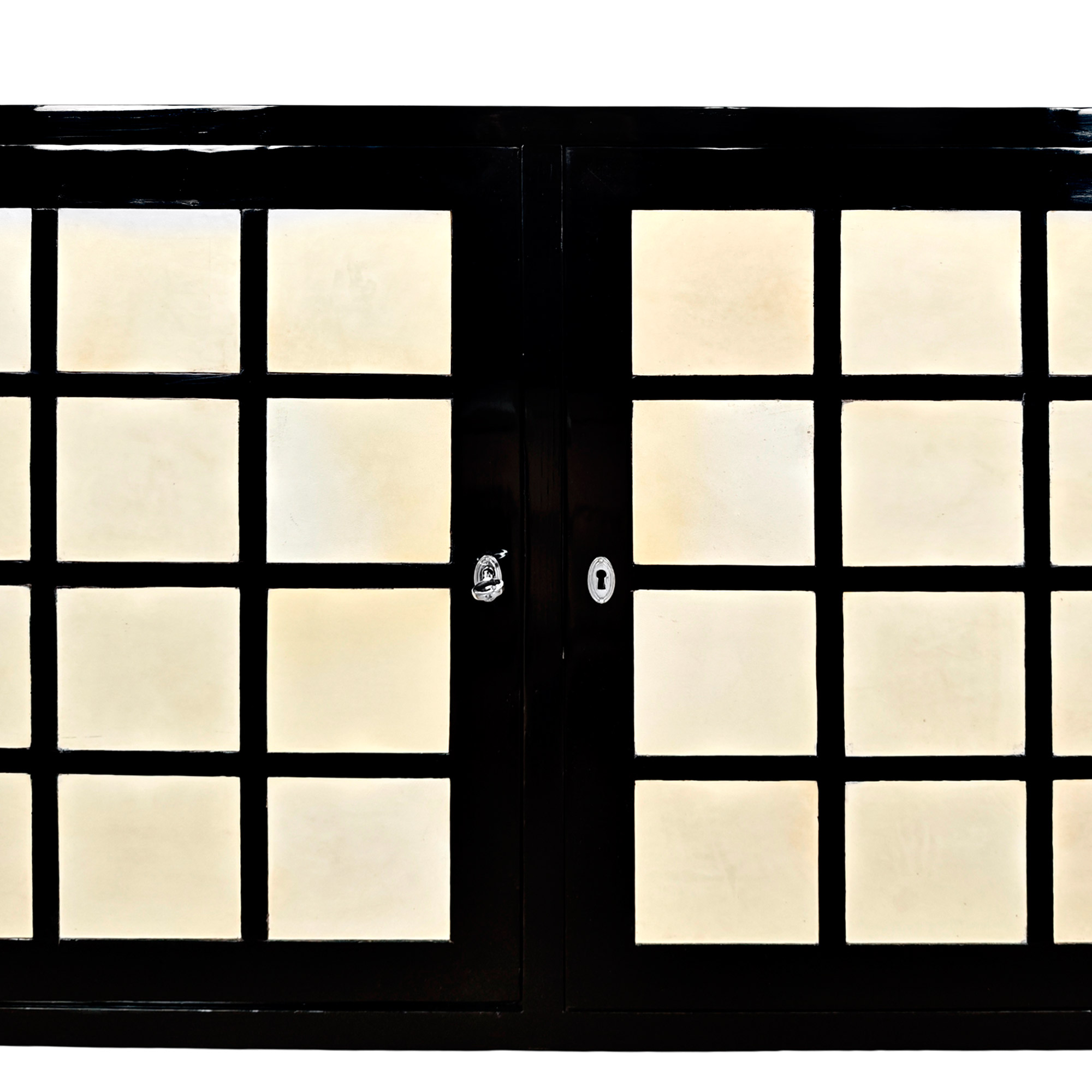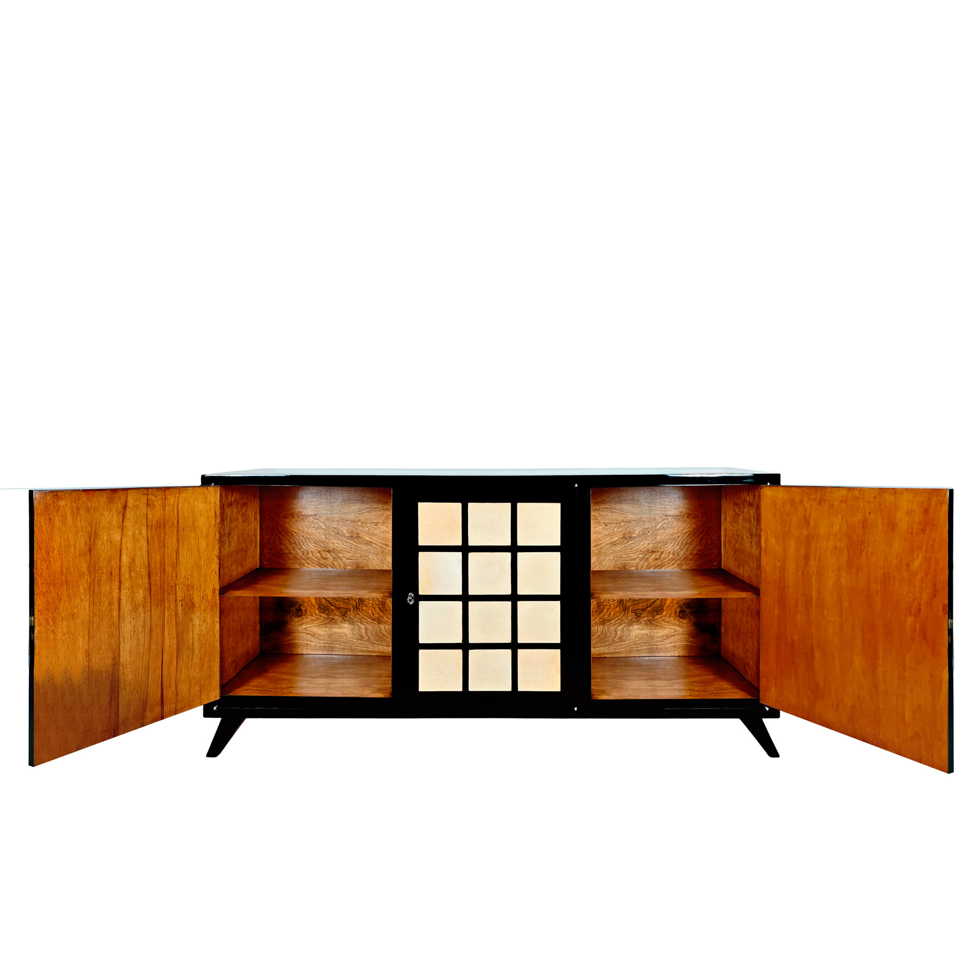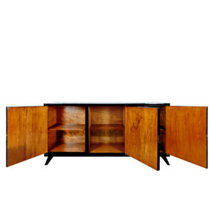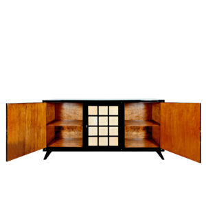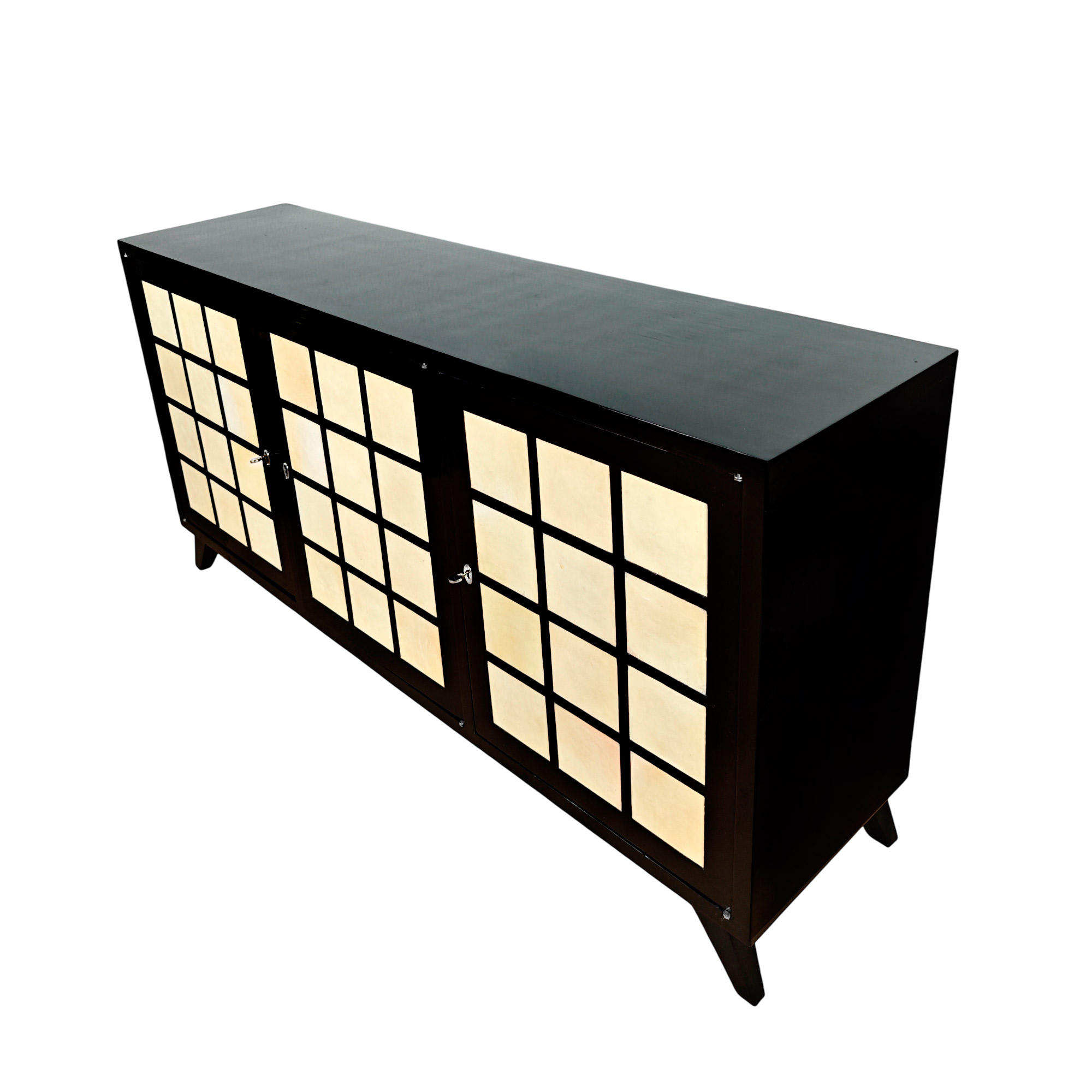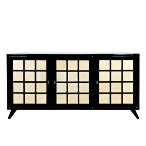 Aparador de tres puertas en cerezo macizo teñido y barnizado a muñeca, decorado con 36 cuadrados de pergamino. Llaves de latón niquelado.