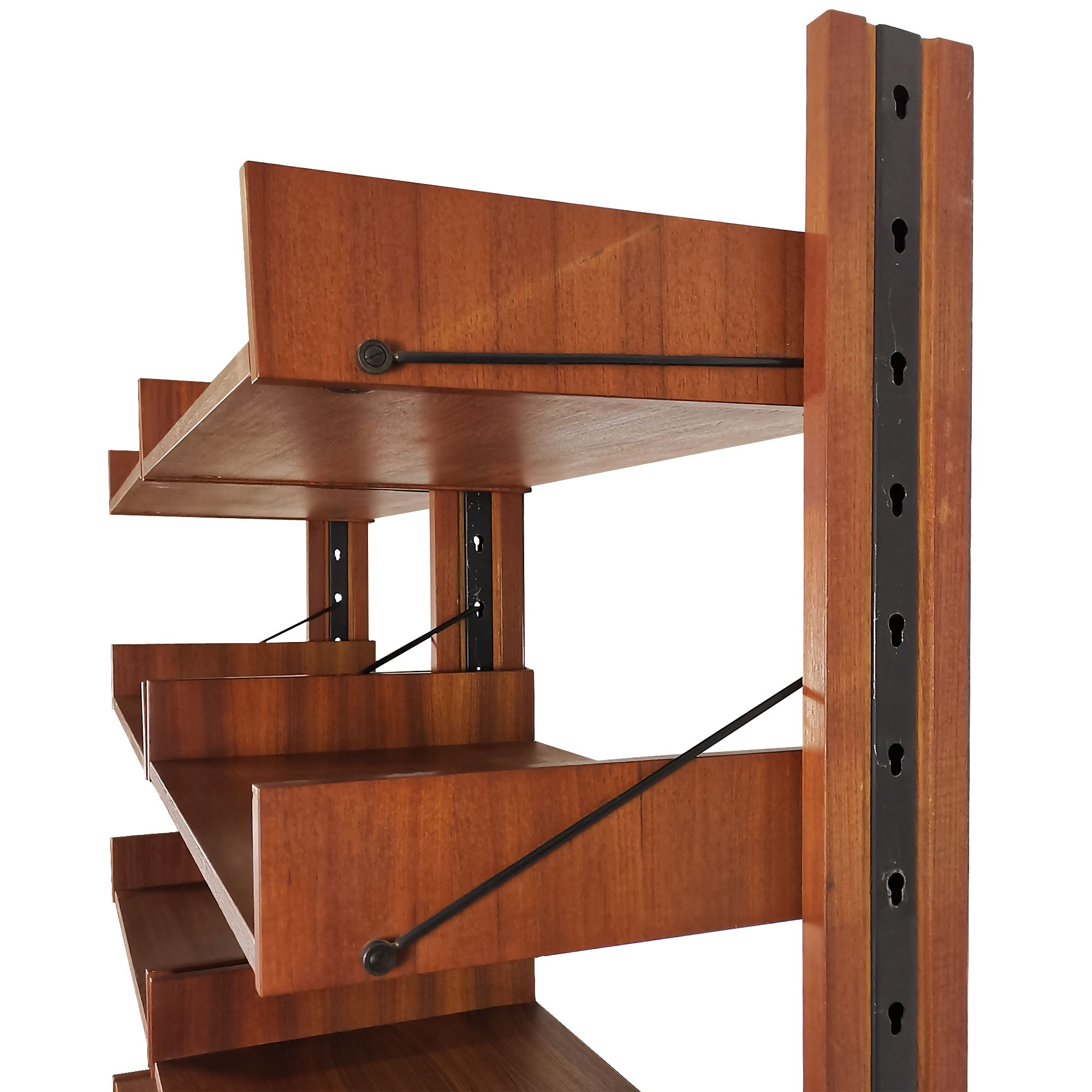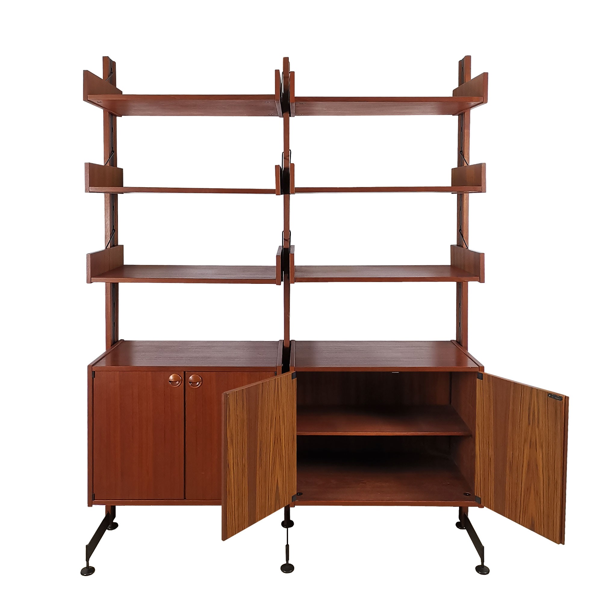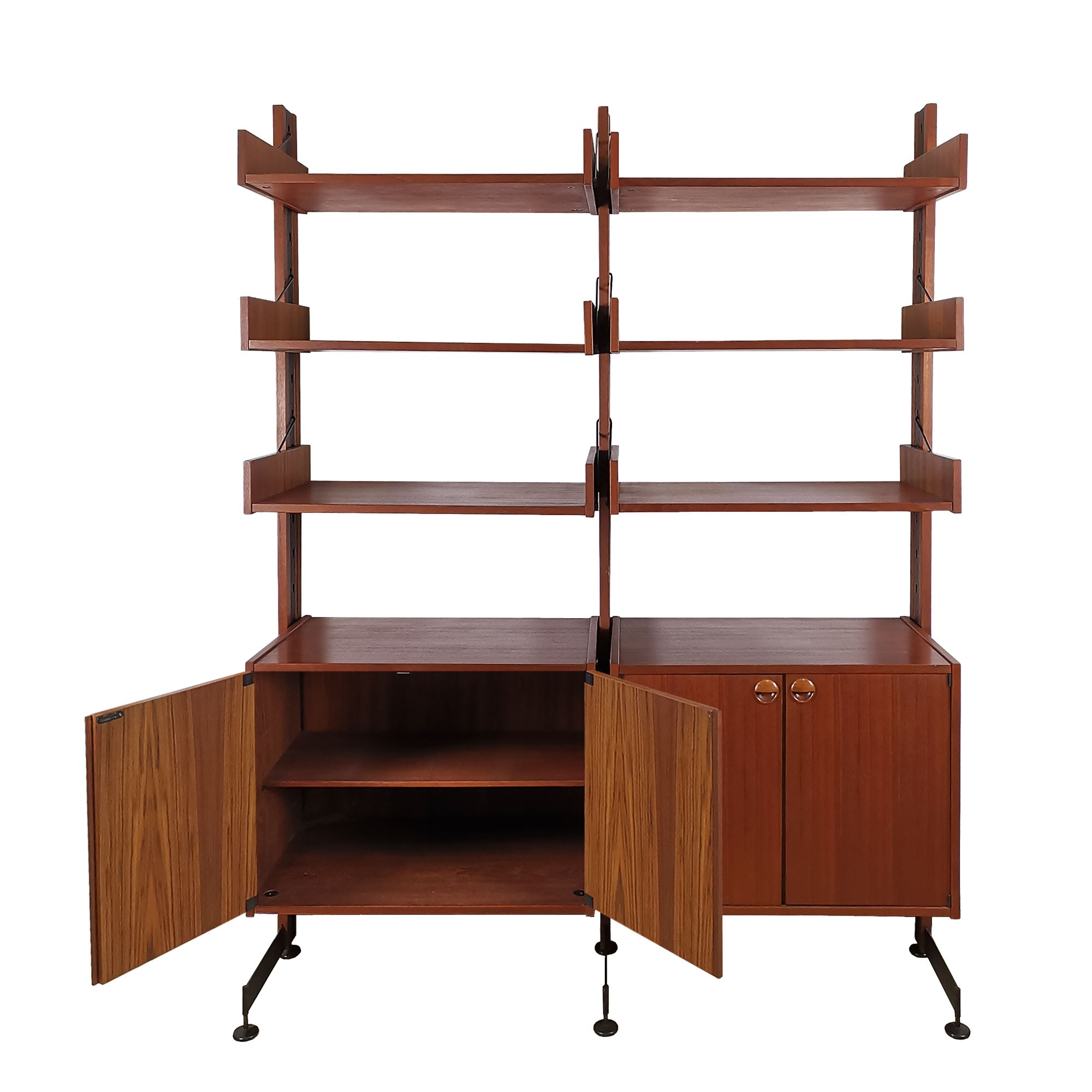 Mueble modular de dos bloques con dos puertas y seis estantes, regulables en altura. Madera chapada de teca y nogal en el interior, barnizados a muñeca con acabado satinado. Parantes y estructura en acero ennegrecido, patas regulables de latón y tiradores de teca incrustados.
