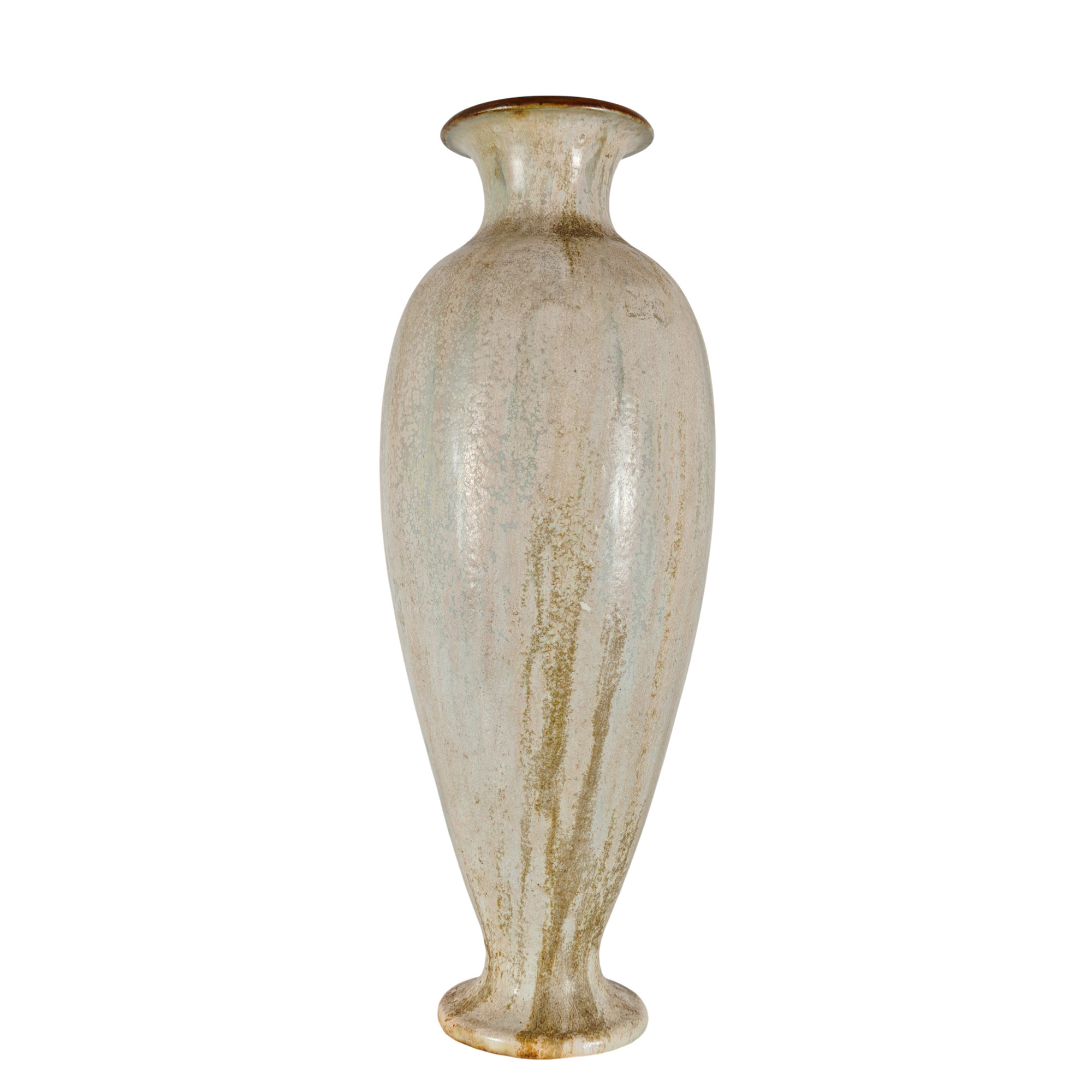 Très grand vase  » Amphore » en grès salé dans les tons ivoire, perle, bleu pâle, vert kaki. Un défaut de cuisson.