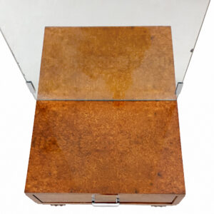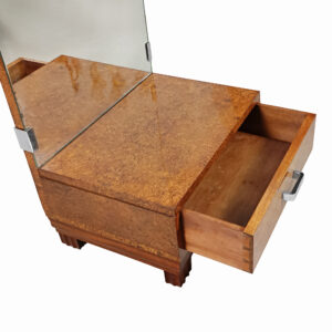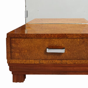 Cheval mirror in solid mahogany and amboyna burl. French polish. Original mirror. Hooks and handle in nickel-plated brass.