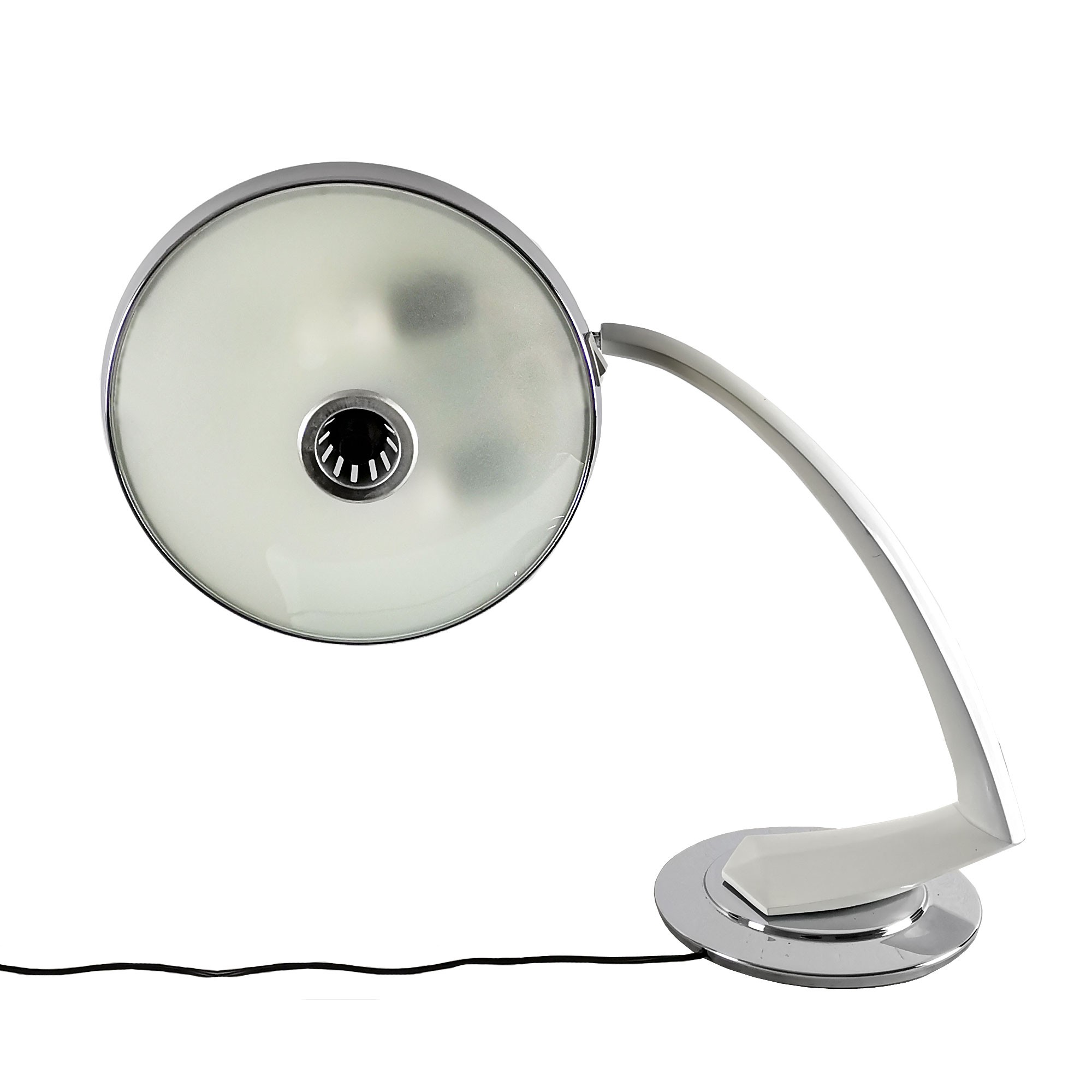 Large desk lamp, white enameled steel arm pivoting on a nickel plated metal round base, frosted glass diffuser with a nickel plated metal cover.
