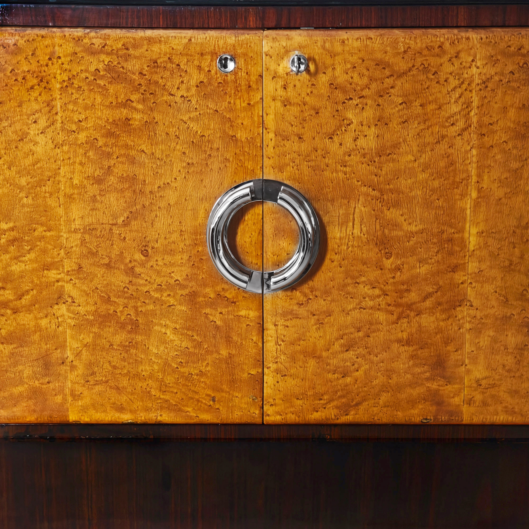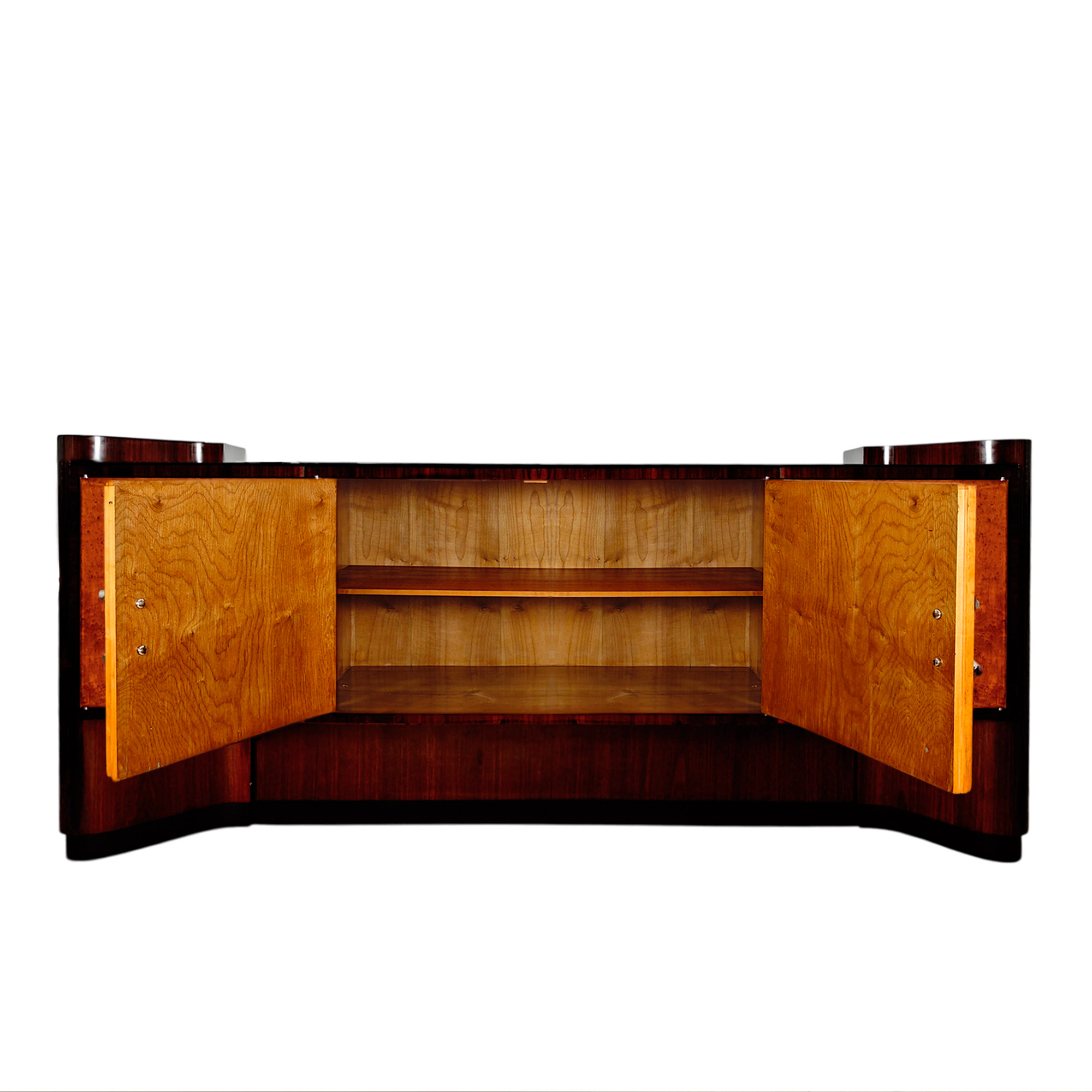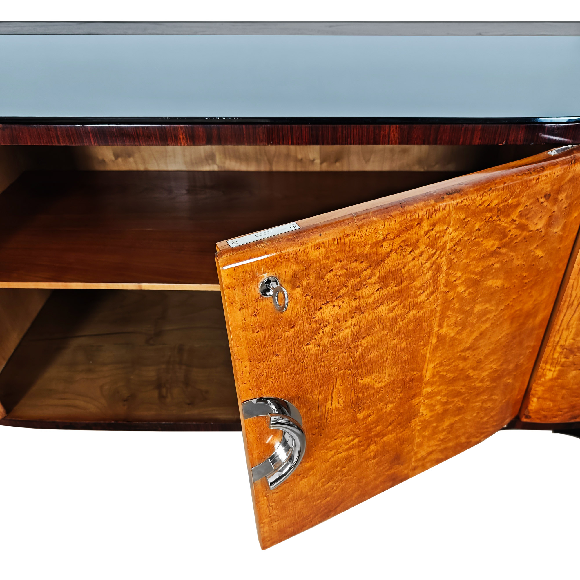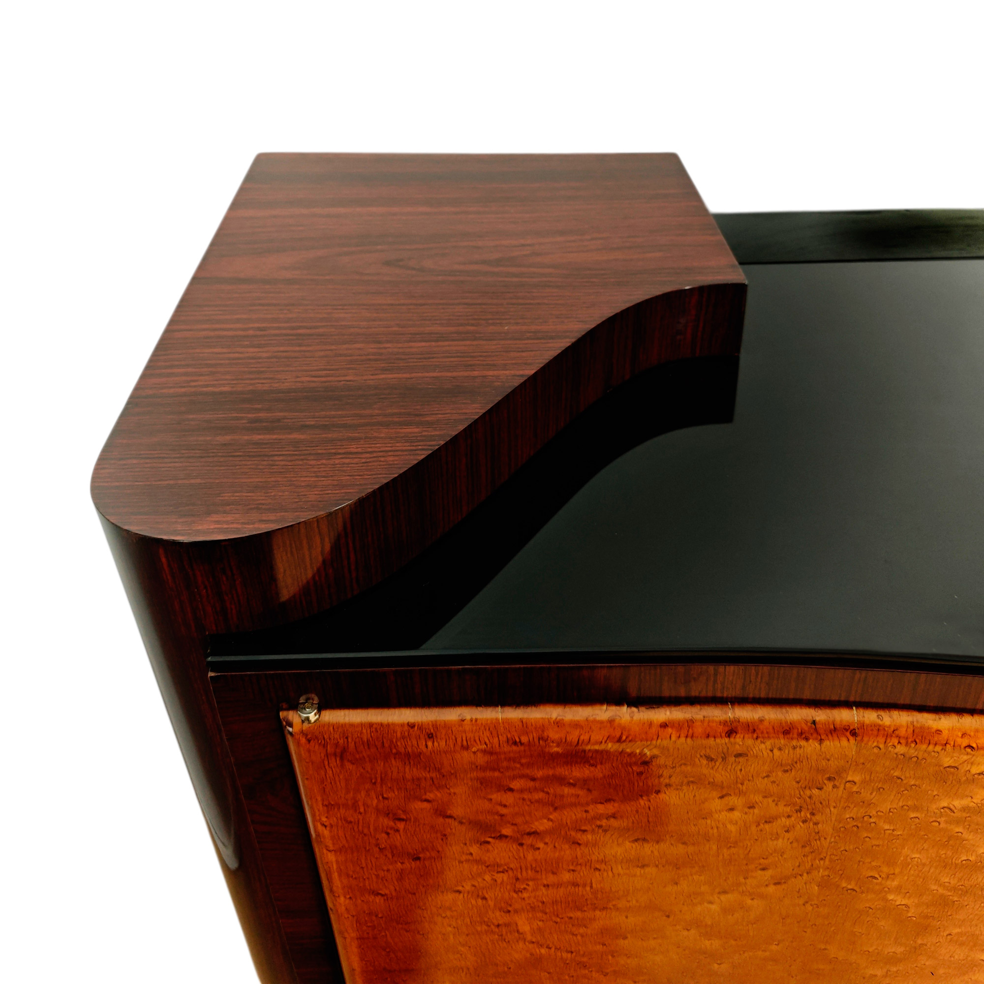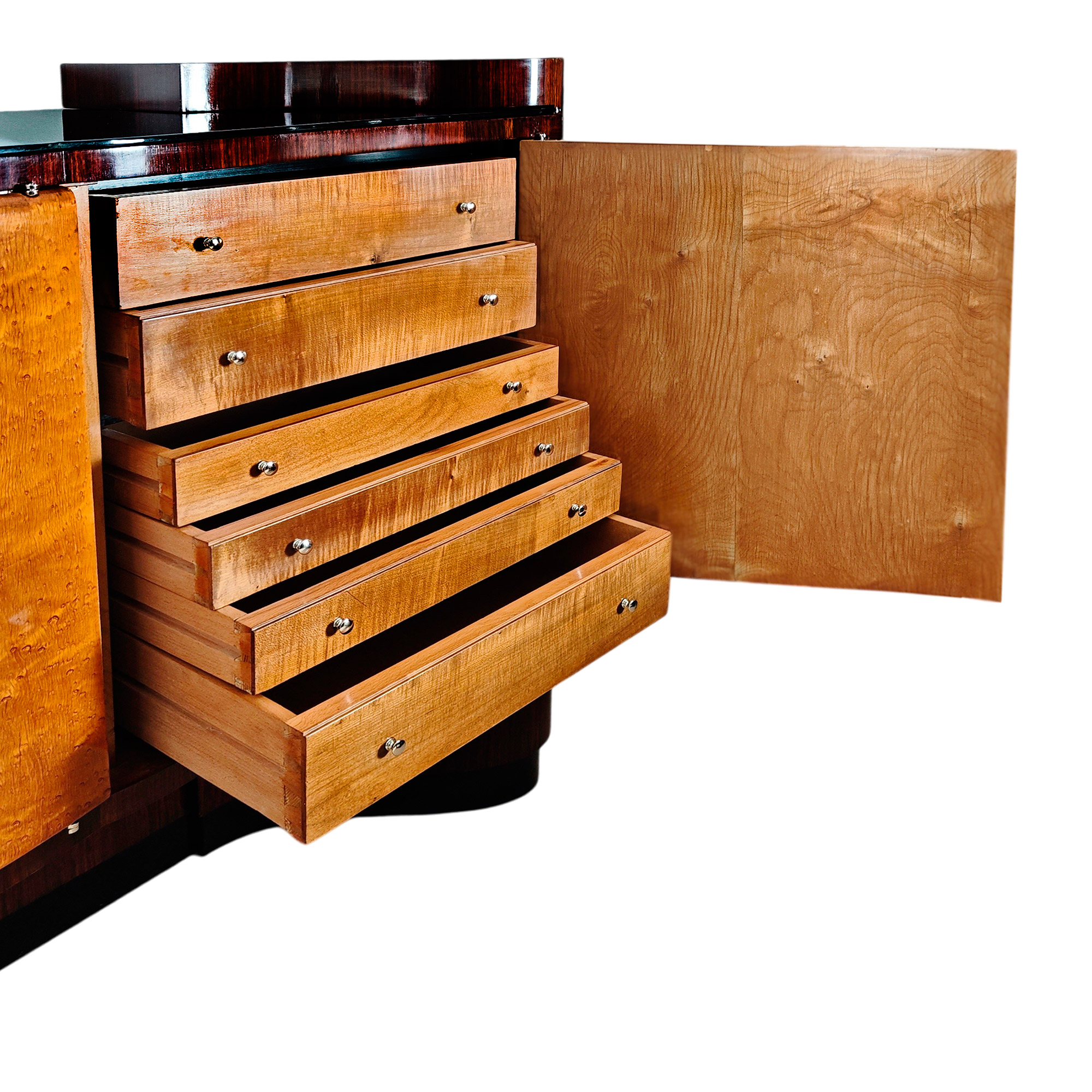 Large Art Deco sideboard, completely dismantlable, in rosewood veneer, with four doors in birdseyes maple veneer (the right-hand door contains six walnut drawers), a black opaline top (with a small chip on one corner), nickel-plated brass handles and hardware, and a French polish finishing.