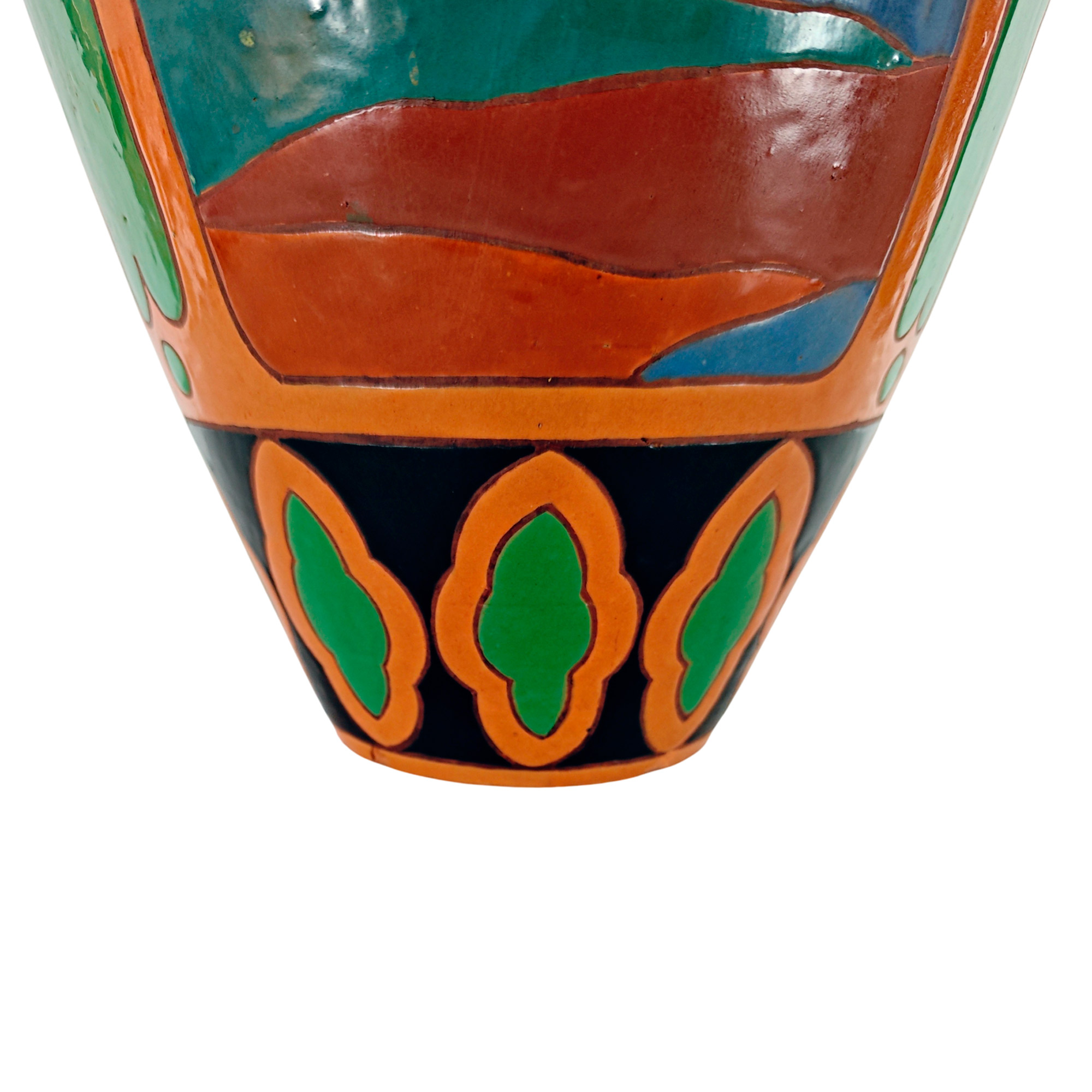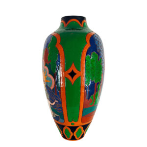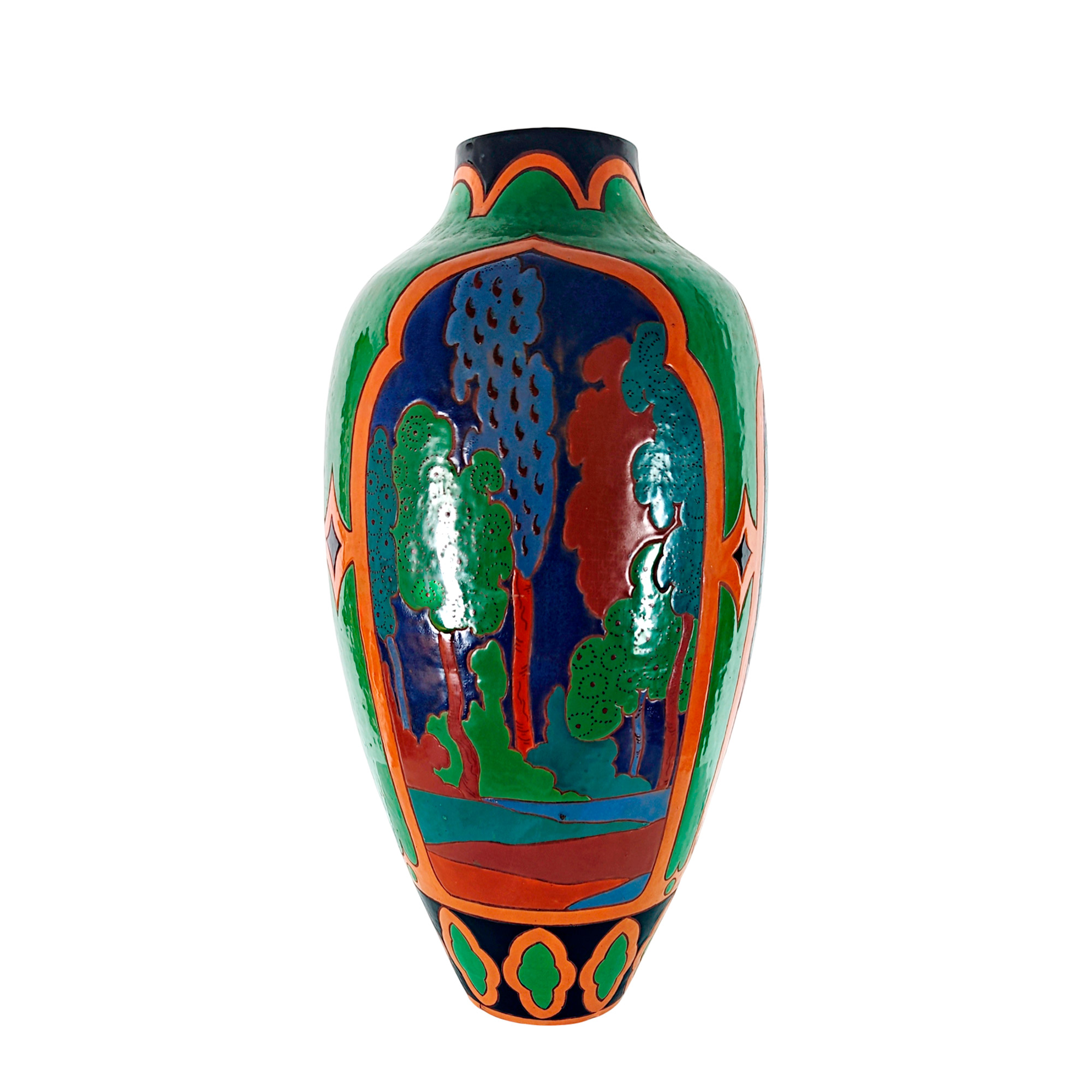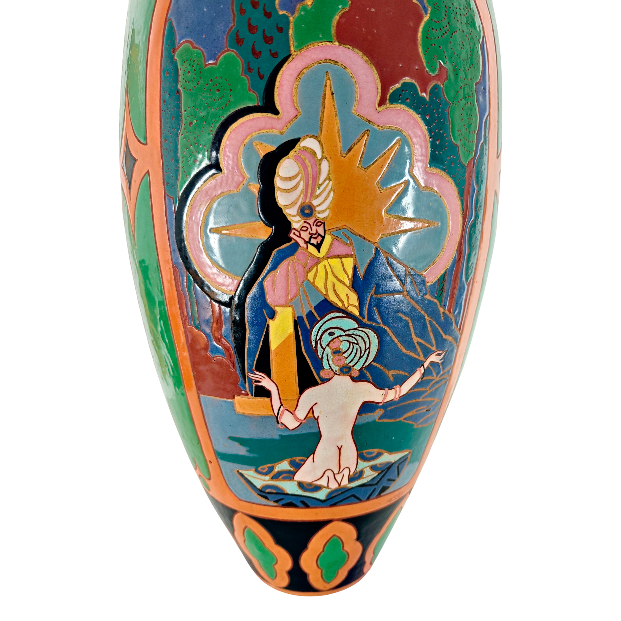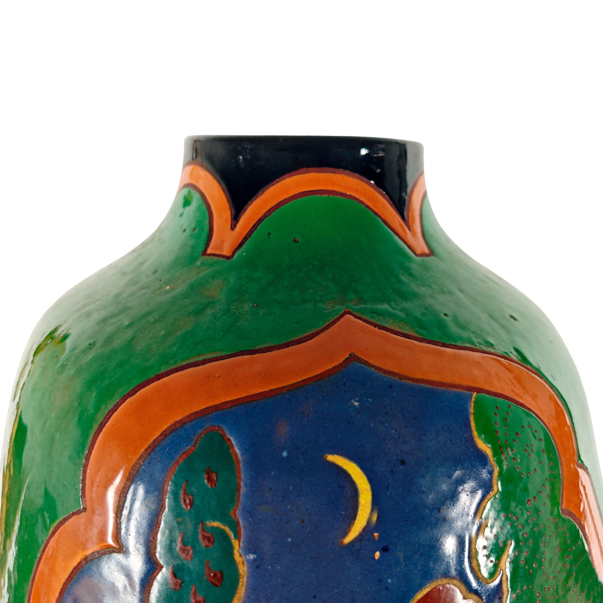 Large Art Deco vase in polychrome glazed stoneware with Orientalist decoration.