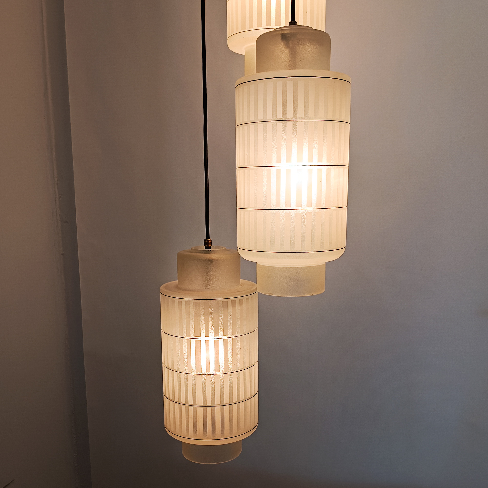 Large hanging lamp with 6 frosted acid-etched glass globes decorated with black lines. Ingenious system for removing glassware. Top plate in white lacquered sheet metal. Black plastic wires.