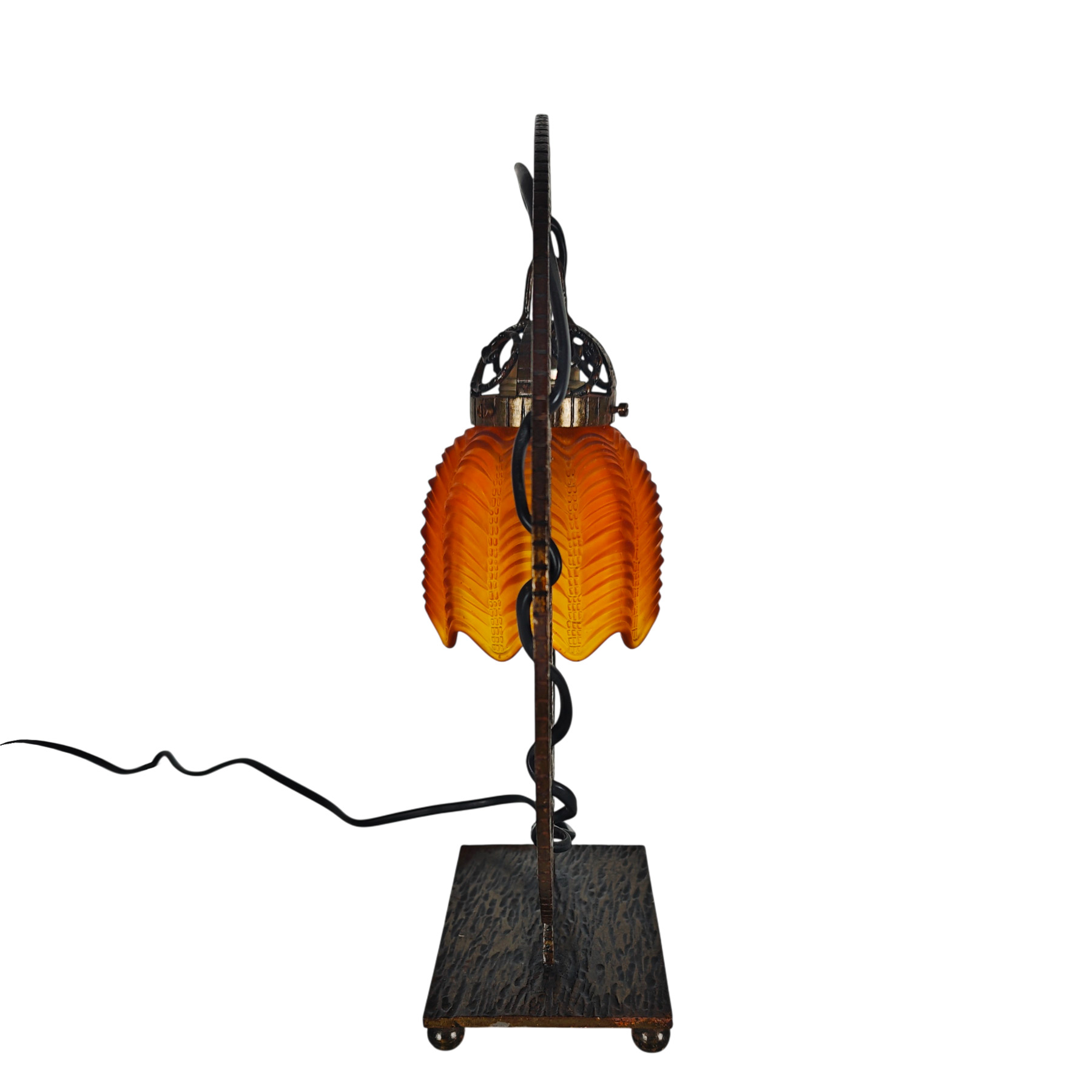 Charming little Art Deco lamp in wrought iron with a tulip-shaped glass lampshade in glass paste.