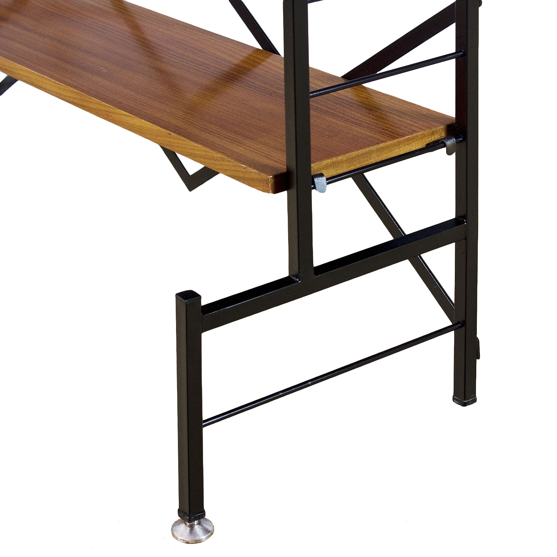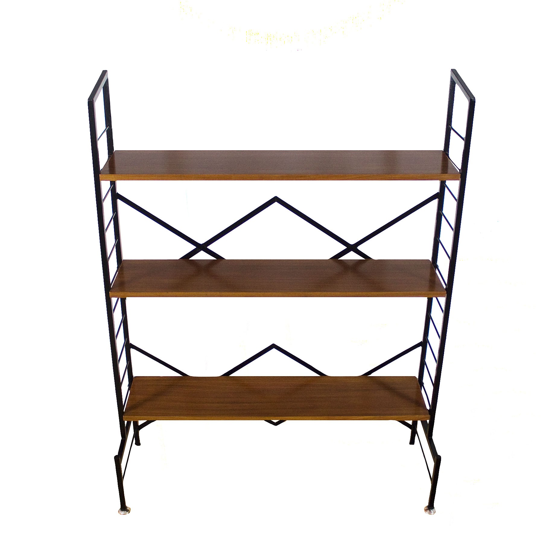 Pair of small bookcases, blackened steel, adjustable mahogany shelves, French polish and waxed. Adjustable nickel plated brass feet.