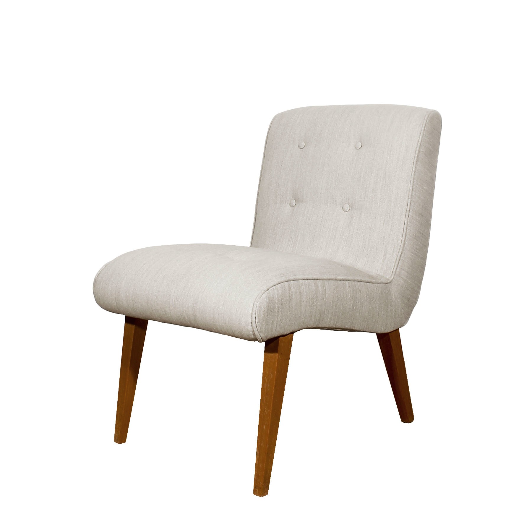 Pair of Vostra low chairs, new upholstery, button padding gray felt, beech wood feet, french polish.